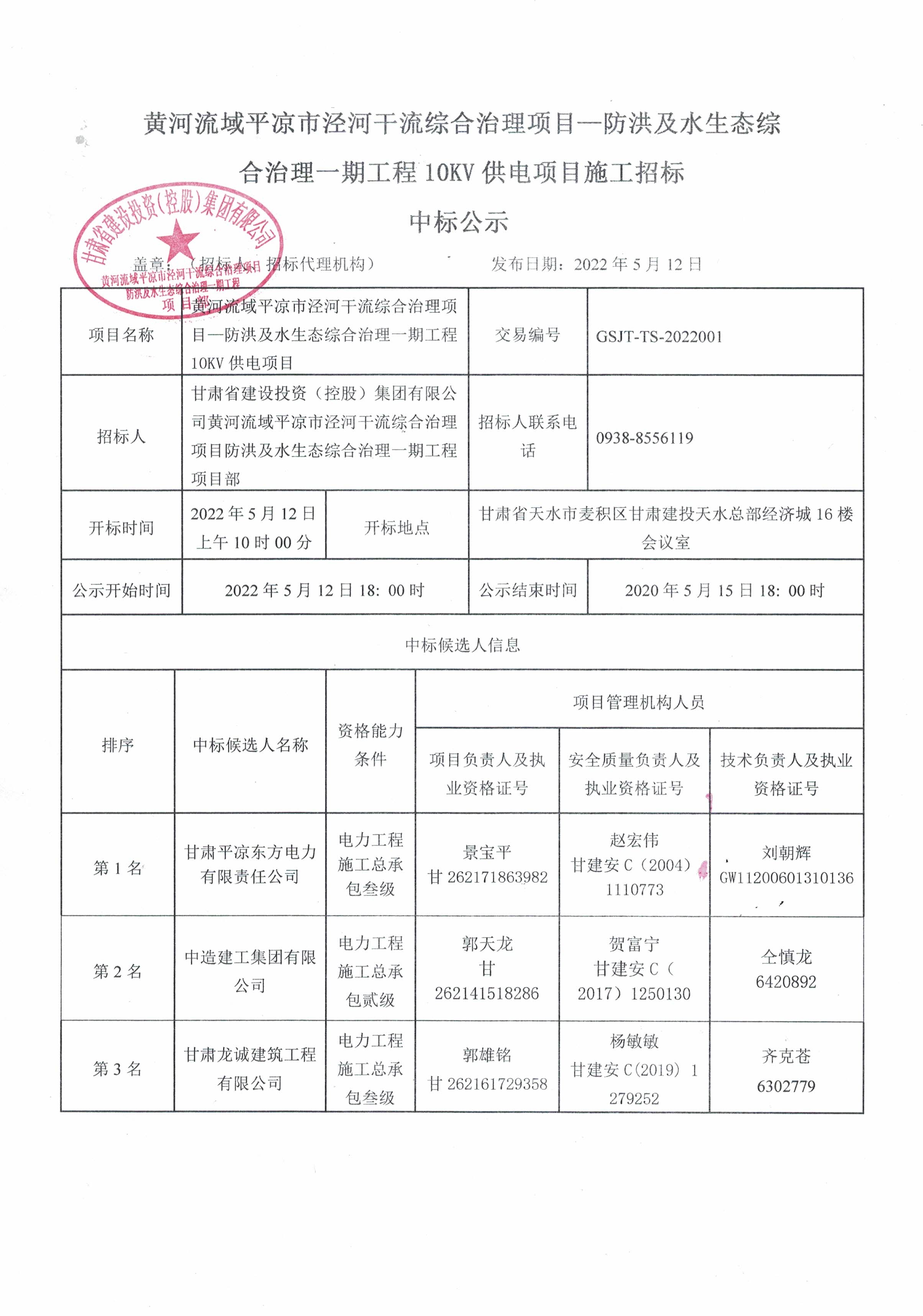 第1名 甘肅平?jīng)鰱|方電力有限責(zé)任公司 電力工程施工總承包叁級(jí) 景寶平